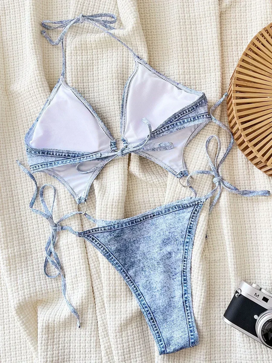 Halter Tummy Cut Out Female Denim Swimwear One Piece Swimsuit Women Backless Monokini High Cut Bathing Suit Swim Beach Wear