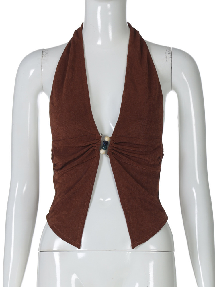 Halter V Neck Crop Tops Women Sleeveless Backless Ruched Tank Tops Female Solid Club Tops Elegant
