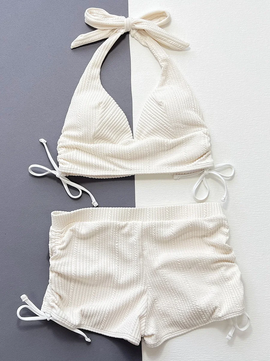 Halter V Neck Ribbed Bikinis Female Swimsuit High Waist Bikini Women Swimwear Two-pieces Bikini Set Shorts Bathing Suit Swim