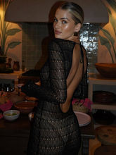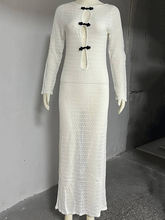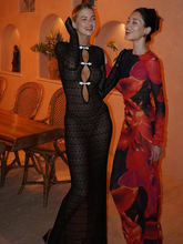 Hollow Out Knit Maxi Dress Women See Through Smock Dress Elegant Long Sleeve Backless Fishtail Dress