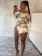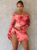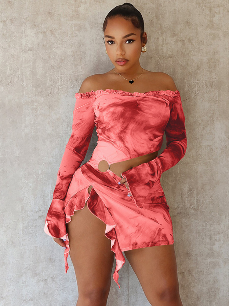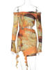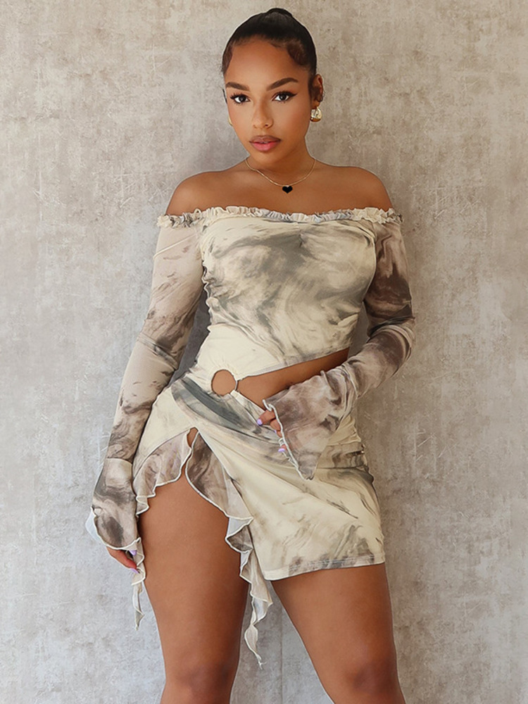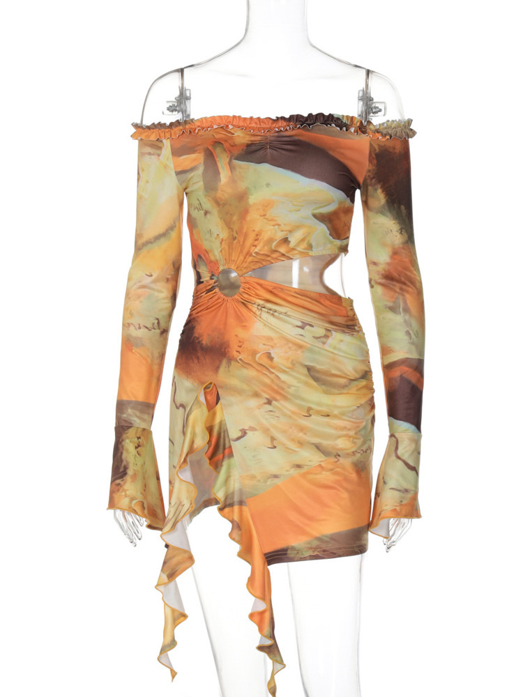 Hollow Out Print Mini Dress For Women Autumn Off-shoulder Long Sleeve Bodycon Ruffled Slit Dress New