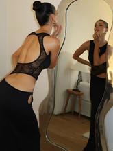 Hollow Out Sleeveless Maxi Dress For Women Black O Neck See Through Lace Backless Bodycon Club Long Dress Fashion