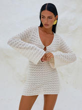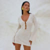 Knitted Beach Dress For Woman White Hollow Out Deep V Neck Long Sleeve High Waist A-line Knit Dress Knitwear