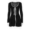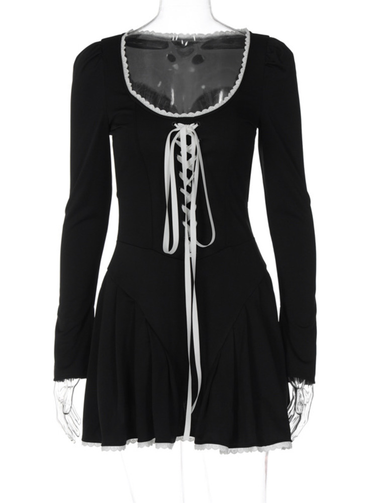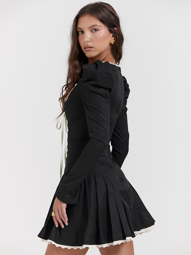 Lace Bandage Puff Sleeve Mini Dress For Women 2025 Autumn Winter Square Collar Ruched Dress Vintage Elegant