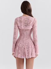 Lace Flare Long Sleeve Mini Dress For Women Robe Autumn Pink O Neck A-line High Waist Pleated Dress Elegant