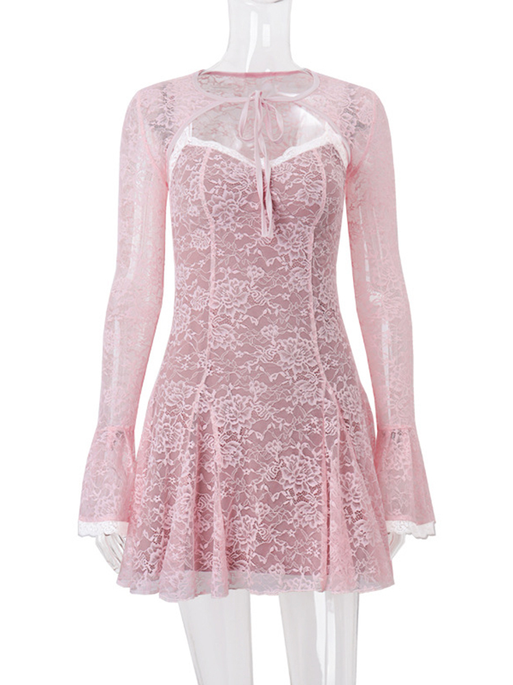Lace Flare Long Sleeve Mini Dress For Women Robe Autumn Pink O Neck A-line High Waist Pleated Dress Elegant