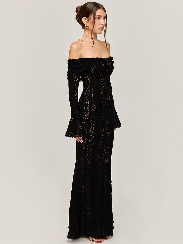 Lace Off-shoulder Maxi Dress Women Strapless Backless Long Sleeve Bodycon Evening Club Party Long Dress Elegant