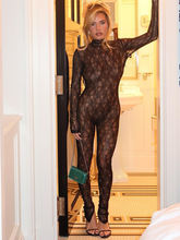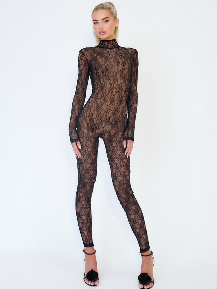 Lace Print Backless Jumpsuits For Women Rompers Black Hollow Out Turtleneck Long Sleeve Jumpsuit Clubwear