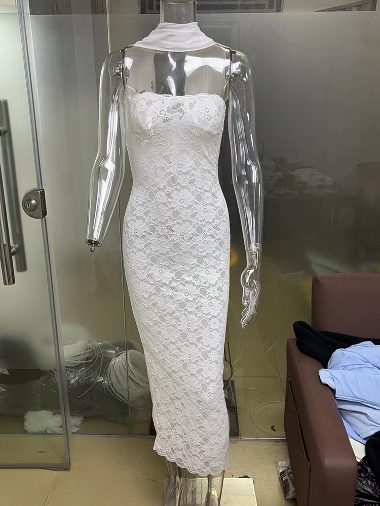 Lace See Through Midi Dress For Women Off-shoulder Strapless Sleeveless Backless Bodycon Club Party Dress