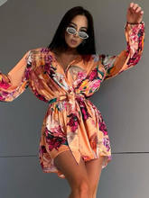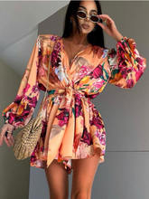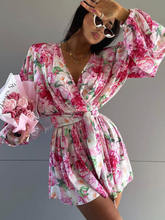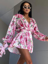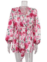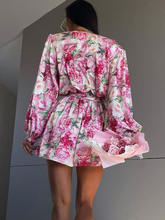 Lantern Sleeve Print Mini Dress For Women V Neck Long Sleeve Lace Up High Waist Pleated Dress Elegant Dresses