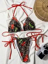 Leopard Cherry Print Halter High Cut Bikini Women Swimwear Female Swimsuit Two-pieces Bikini set Bather Bathing Suit Swim Lady