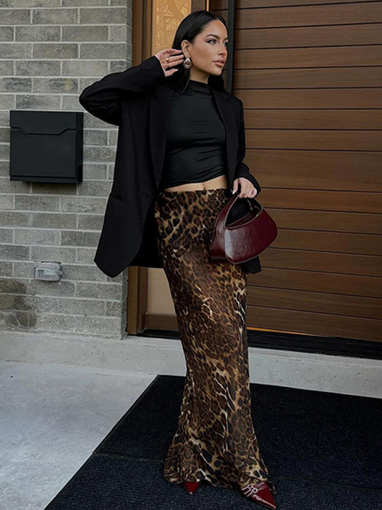 Leopard Print High Waist Maxi Skirt Women Autumn Winter Slim Fit Elegant Club Party Print Long Skirts