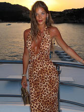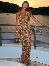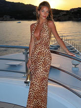 Leopard Print Maxi Dress For Women Halter Deep V Neck Sleeveless Backless Bodycon Club Party Dress