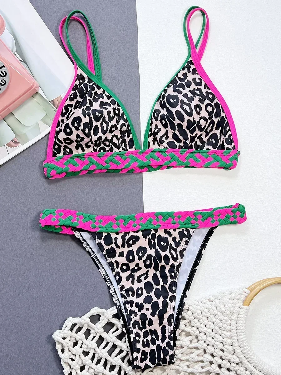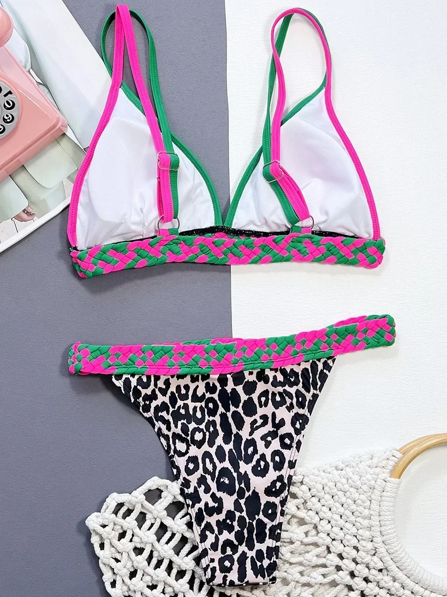 Leopard Print Splicing High Cut Bikini Female Swimsuit Women Swimwear Two-pieces Bikini Set Weaved Bather Bathing Suit Swim Lady
