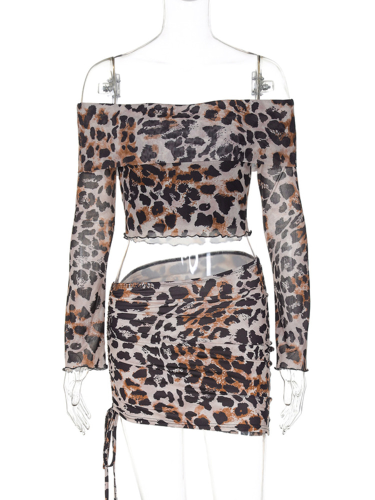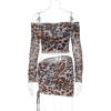 Leopard Print Two Piece Sets Women Off-shoulder Long Sleeve Crop Tops And Mini Skirt Matching Sets Hot Skirt Set