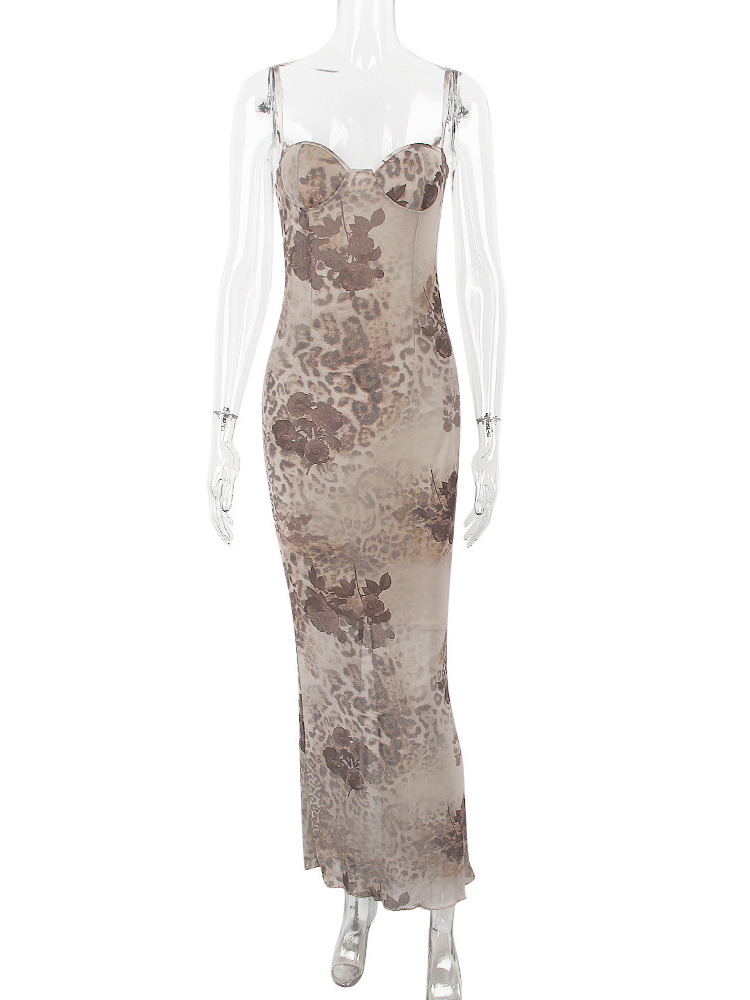 Mesh Floral Print Maxi Dress Women Spaghetti Strap Sleeveless Lace-up Split Sundress Ladies Club Party Long Tank Dress