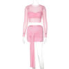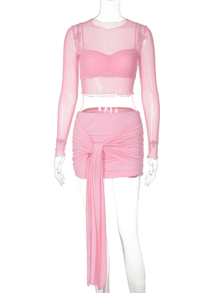 Mesh Hot Skirt Three Piece Sets Women Pink See Through Long Sleeve T-shirt And Mini Skirt Matching Sets Ladies Set