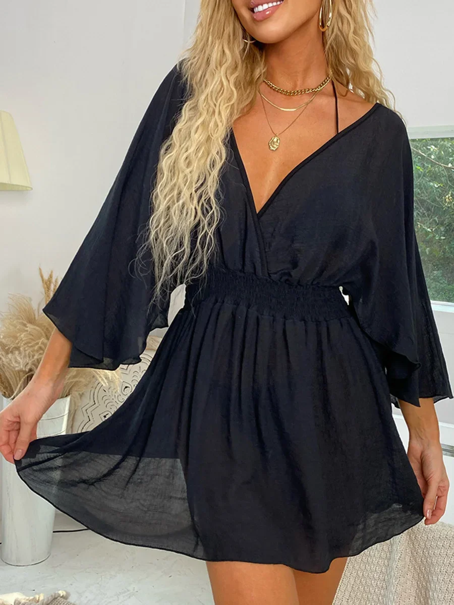 Mesh V Neck Long Sleeve Chiffon Tunic Beach Cover Up Beach Cover-ups Beach Dress Backless Beachwear Female Kaftans for Woman