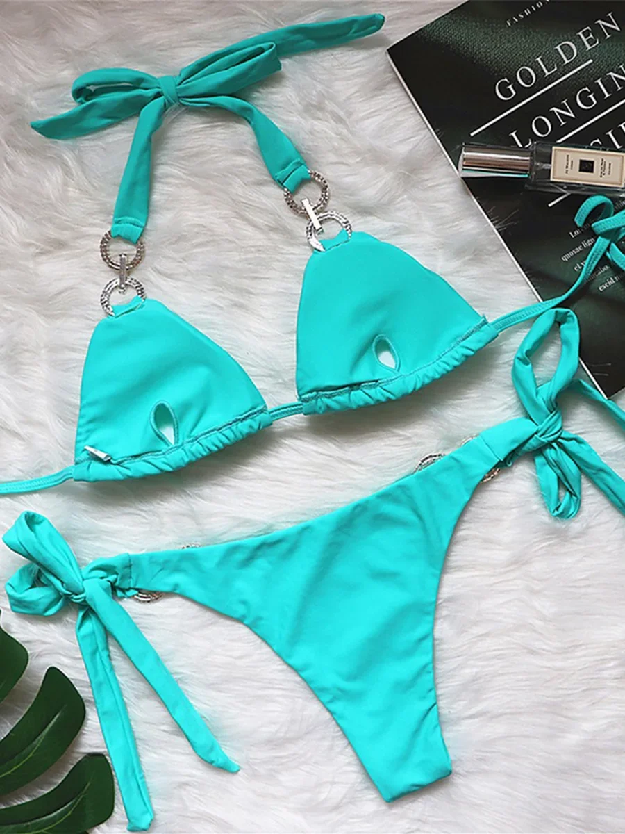Metal Chains Rhinestone Diamond Bikini Women Swimsuit Female Swimwear Two Pieces Bikini Set Halter Bathing Suit Swim Beach Wear