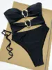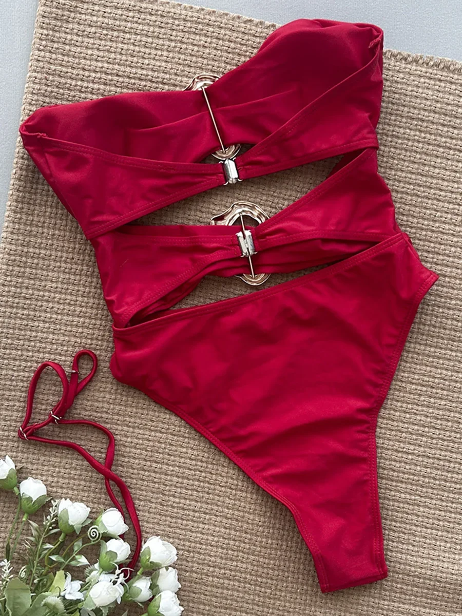 Metal Ring Hollow Out Women Swimwear One Piece Swimsuit Female Bandeau Monokini High Cut Bather Bathing Suit Swim Beachwear