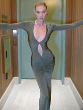 Moziision Hollow Out Long Sleeve Ruched Maxi Dress Women Green Deep V Neck Bodycon Evening Club Party Long Dress Elegant