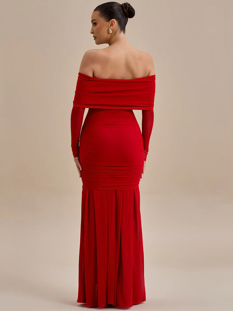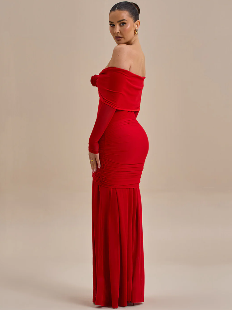Off-shoulder Strapless Rose Maxi Dress For Women Long Sleeve Backless Ruched Bodycon Club Party Dress