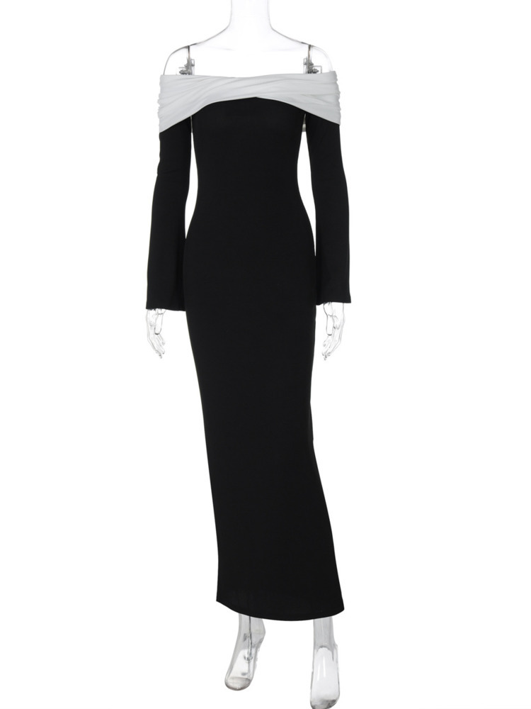 Patchwork Off-shoulder Maxi Dress For Women Strapless Long Sleeve Backless Bodycon Club Party Dress