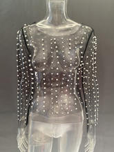 Pearl Mesh See Through T-shirt Women Long Sleeve Pullover Blouse Ladies Summer U Neck Tee Shirt Tops
