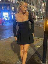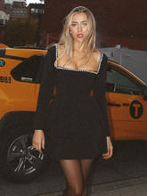 Pearl Square Collar Long Sleeve Mini Dress For Women Robe Backless A-line Dress Ladies Autumn Fall Elegant Dresses