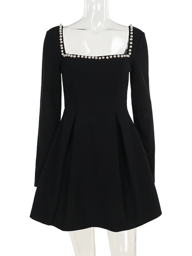 Pearl Square Collar Long Sleeve Mini Dress For Women Robe Backless A-line Dress Ladies Autumn Fall Elegant Dresses