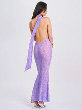Purple Sheer Leopard Print Maxi Dress Women See Through Halter Draped Sleeveless Backless Bodycon Party Long Dress