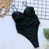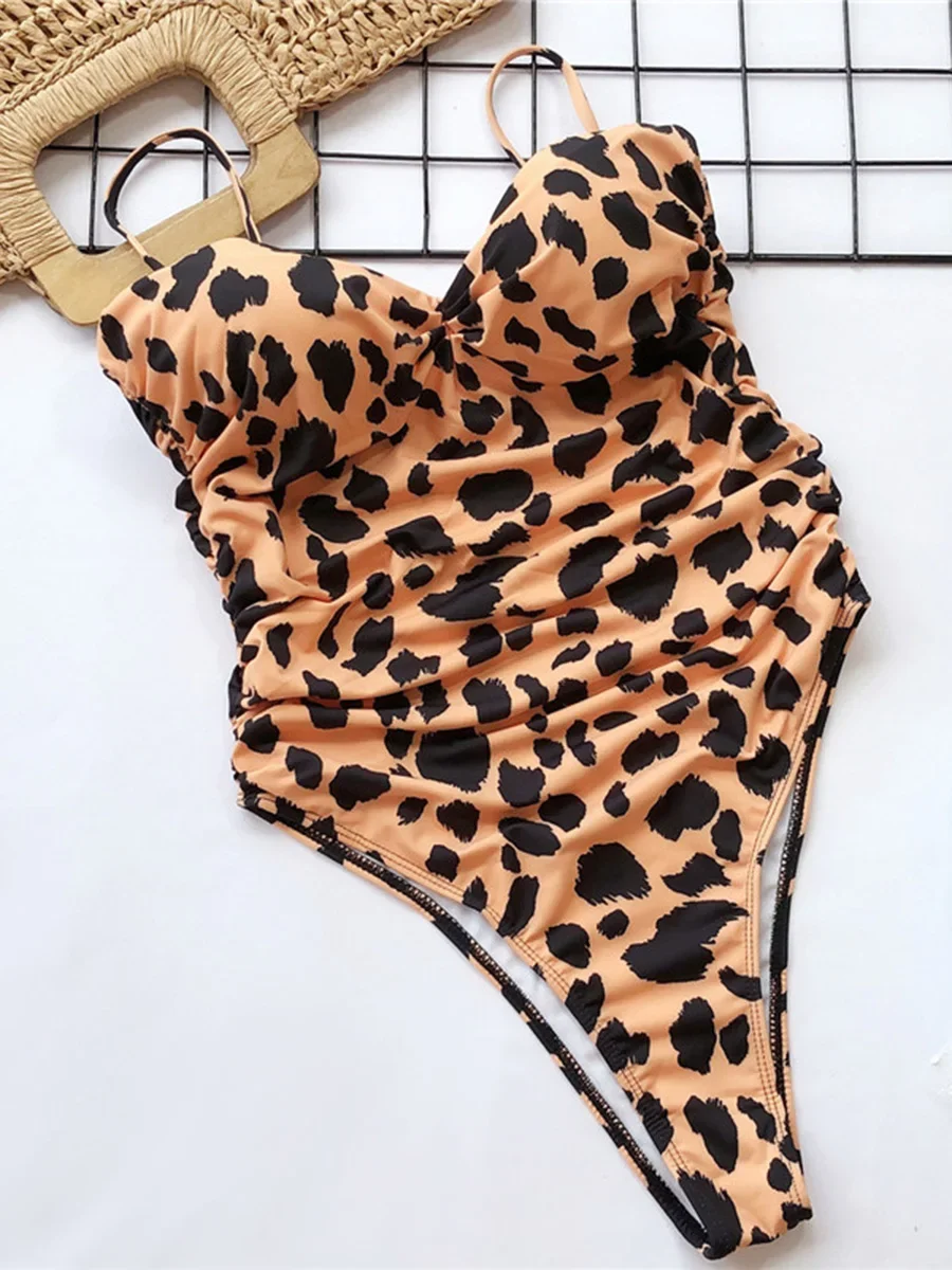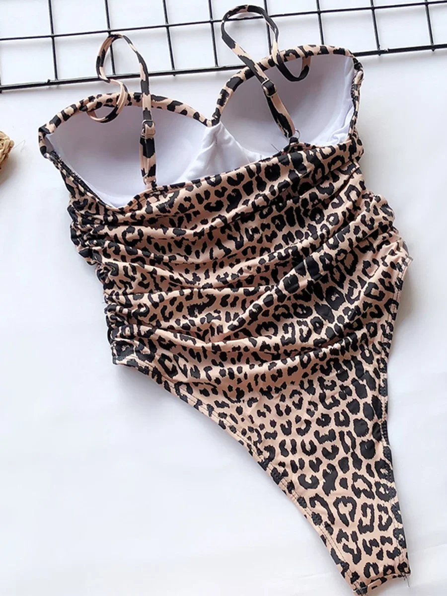 Push Up Bra Cup Leopard Scrunched Women Bandeau Swimwear One Piece Swimsuit Female Monokini High Cut Bathing Suit Swim Bodysuit