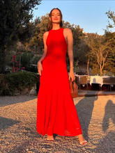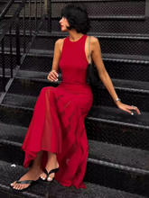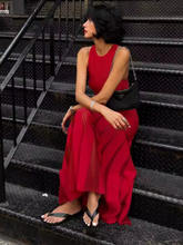 Red Sleeveless Knit Dress For Women Hollow Out O Neck Pleated Maxi Dress Ladies Solid Beach Party Long Dress