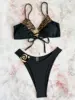 Ribbed Splicing Leopard Bikini Women Swimsuit Female Swimwear Two-pieces Bikini Set Metal Chains Bathing Suit Swim Beach Wear