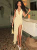 Ruffle V-neck Backless Sleeveless Lace-up Thigh Split Patchwork Maxi Dress For Women Slim Party Evening Dress
