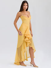 Ruffled Draped Ruched Maxi Dress For Women Yellow Spaghetti Strap Sleeveless Backless Club Party Long Dress