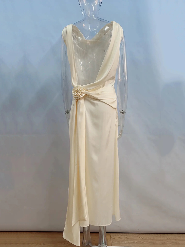 Satin Backless Maxi Dress For Women Elegant Rose Thigh High Split Beach Holiday Long Dress Gorgeous Club Gown