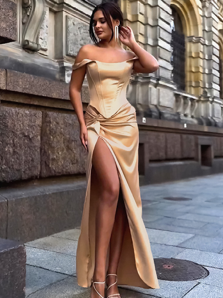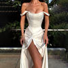 Satin Strapless Thigh High Split Maxi Dress For Women Solid Off-shoulder Backless Sleeveless Bodycon Long Dress