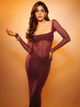 See Through Mesh Maxi Dress For Women Square Collar Long Sleeve Ruched Bodycon Club Party Long Dress