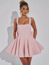 Sequins Bow Backless Mini Dress For Women Robe Square Collar Sleeveless High Waist A-line Club Dress
