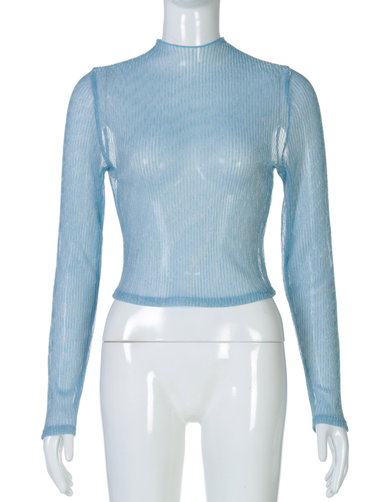 Sheer Mesh Long Sleeve T-shirt Women See Through Turtleneck Crop Tops Female Elegant Pullovers T-shirts