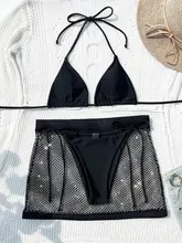 Shiny Diamond Fishnet Skirt Micro Bikini Female Swimsuit Women Swimwear Three-pieces Bikini Set Bathing Suit Swim Beach Wear