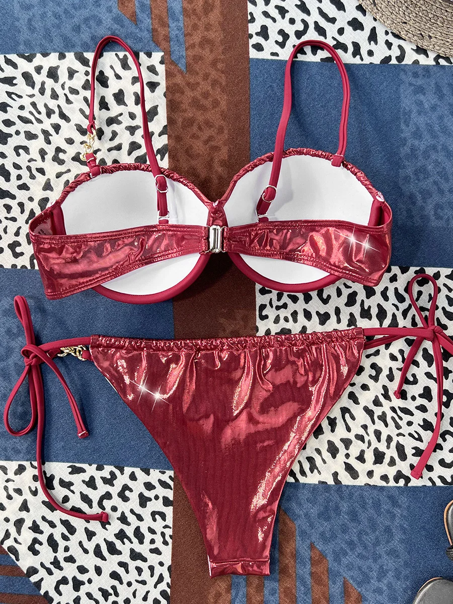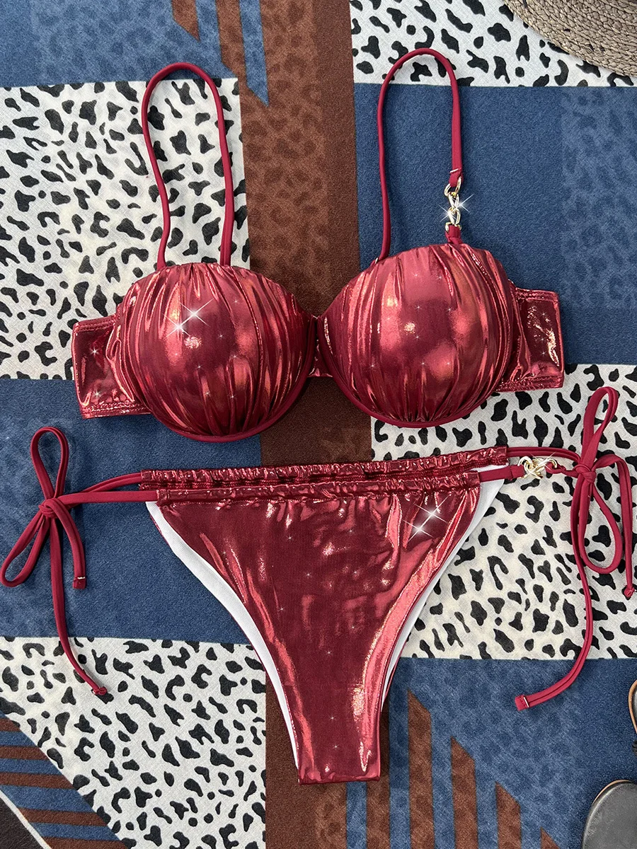 Shiny PU Leather Underwired Bra Cup Bikini Women Swimwear Female Swimsuit Two-pieces Bikini Set Push Up Bathing Suit Swim Lady
