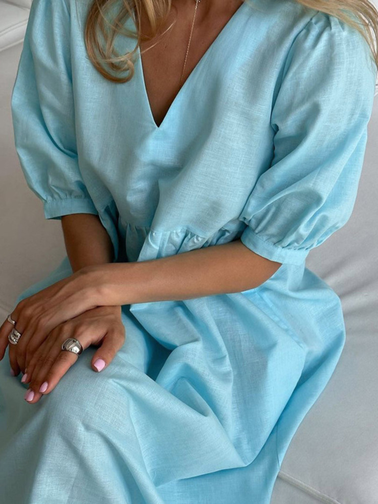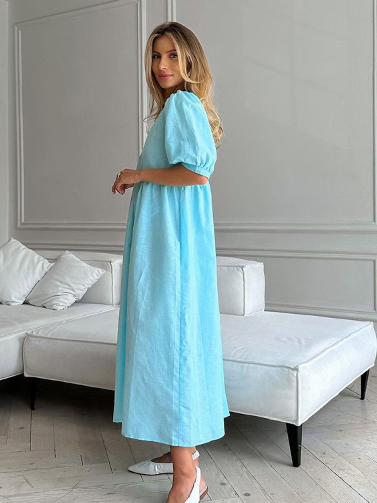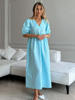 Short Puff Sleeve Maxi Dress For Women Autumn Blue V Neck Loose Basic Casual Long Dress Elegant Gown