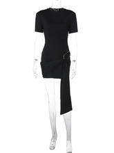 Short Sleeve Draped Mini Dress For Women Black Metal Buckle O Neck High Waist Bodycon Club Dress Vestido Clothes