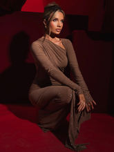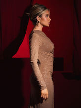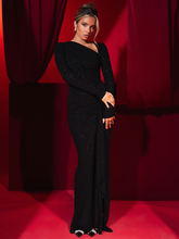 Sparkle Long Sleeve Ruched Maxi Dress For Women Gown Skew Collar Draped Thigh High Split Club Long Dress