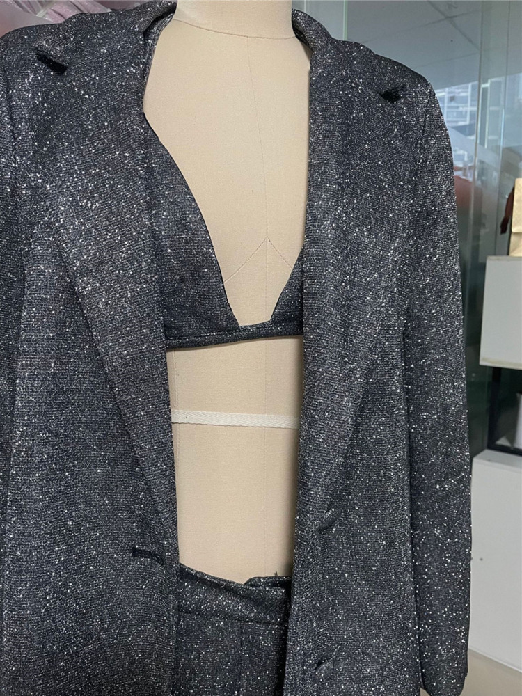 Sparkle Pants Sets Women Autumn Winter Glitter Long Sleeve Blazer Bra And Trousers Femme Shiny Three Piece Set
