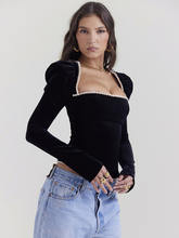 Square Collar Backless Bandage T-shirt Women Autumn Winter Black Shoulder Pad Sleeve Skinny Party Tops