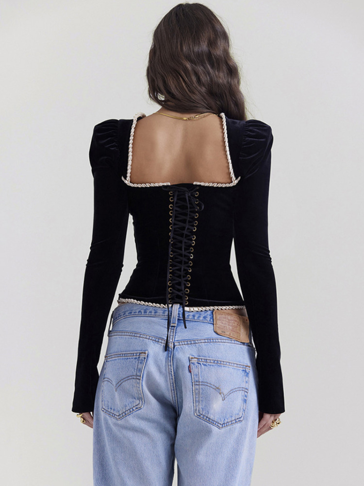Square Collar Backless Bandage T-shirt Women Autumn Winter Black Shoulder Pad Sleeve Skinny Party Tops