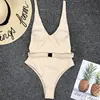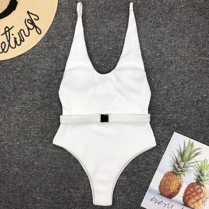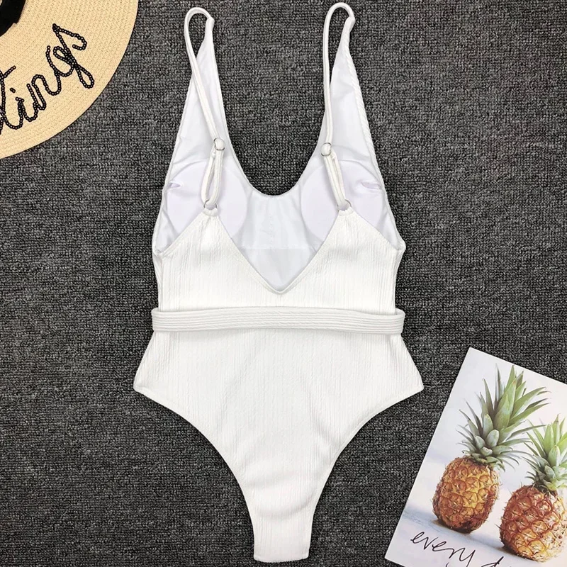 V Neck Ribbed High Cut Women Swimwear One Piece Swimsuit Female Backless Monokini with Waist Belt Bathing Suit Swim Beachwear